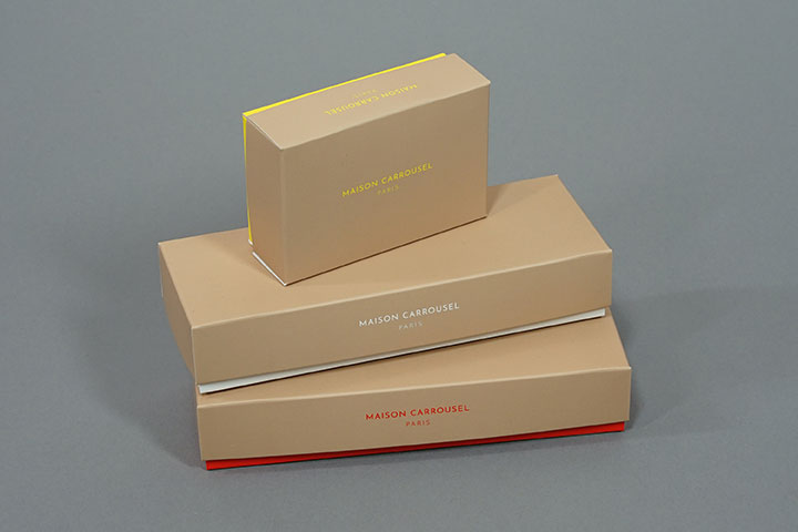 Cette boîte conçue dans notre atelier offre l’avantage de ressembler à un coffret rigide tout en étant entièrement réalisée en carte pliante, stockée à plat. Les logements contiennent les friandises. La gamme est déclinée par couleur selon les produits.
